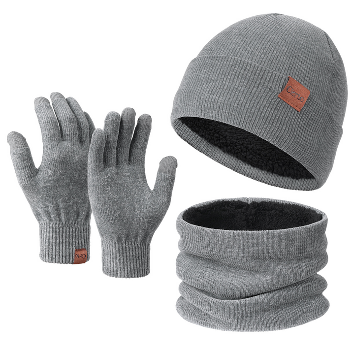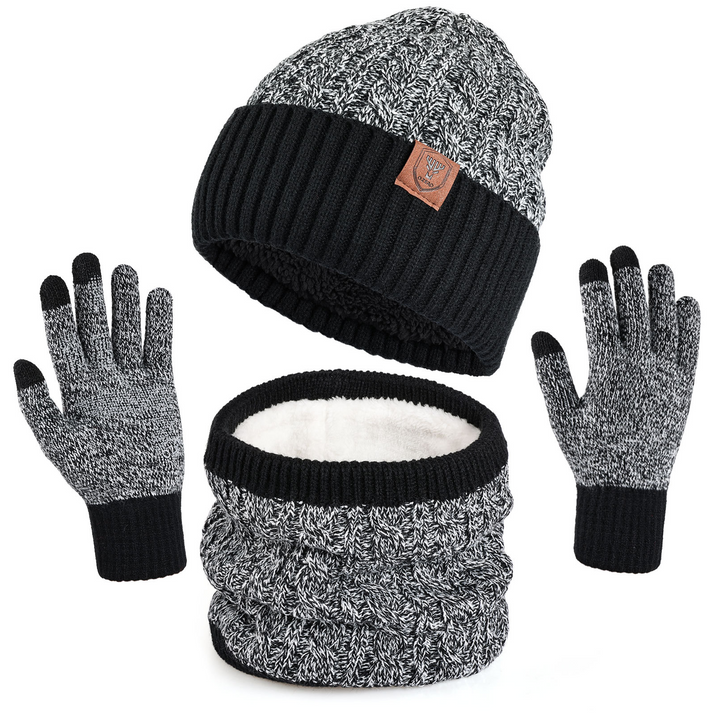 Answer 1: This set includes one Winter Beanie Knitted Hat, one Circle Scarf, and one pair of Touchscreen Gloves, providing a complete solution for winter outdoor activities and keeping warm.